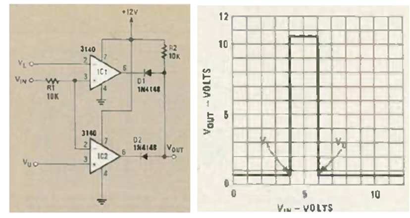 Unlike the previous circuit, the output of this one goes high in the window voltage range. The circuit is from Radio Electronics from June 1986 and is based on the CA3140.