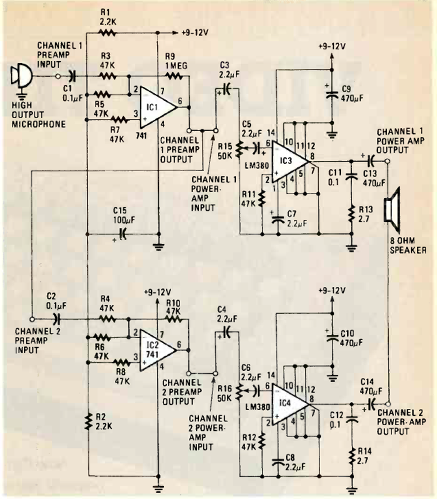 This PA or Public Address amplifier with a few watts of power was found in the March 1986 Radio Electronics magazine. It uses two LM380 ICs in bridge mode for higher power.