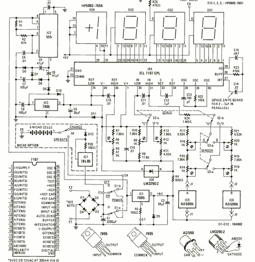 This circuit is from a Radio Electronics magazine from July 1979. It uses the well-known IC 7107, a liquid crystal exciter that became popular in circuits of this type at the time.