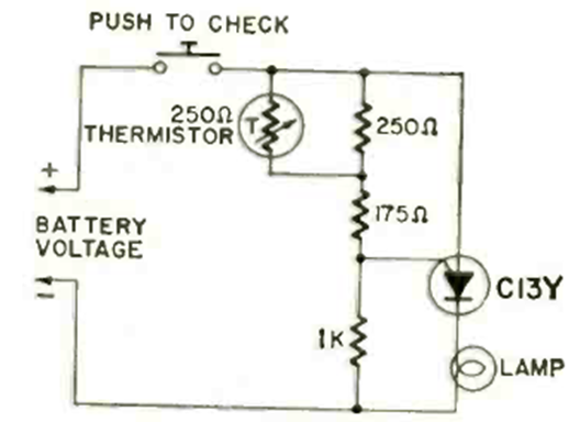 We found this circuit in a November 1970 Radio Electronics. It uses a PUT or programmable unijunction transistor and an indicator lamp.