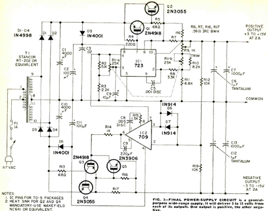 This circuit was obtained from the September 1971 issue of Radio Electronics magazine. The power transistors must be equipped with heat sinks. The 709 is an operational amplifier of the time.