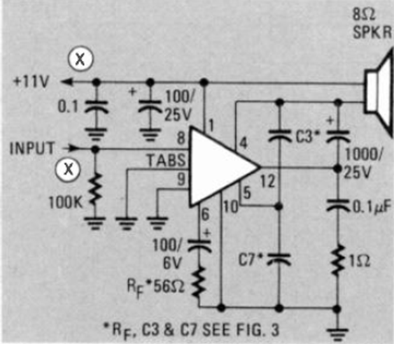 This small audio amplifier of a few watts found in television sets was published in the magazine Radio Electronics of November 1980. The circuit must be powered with a voltage of 11 V.