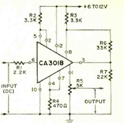 This Schmitt trigger with the CA3018 integrated circuit was found in the November 1970 issue of Radio Electronics magazine. The output signal strength is adjusted by R5.