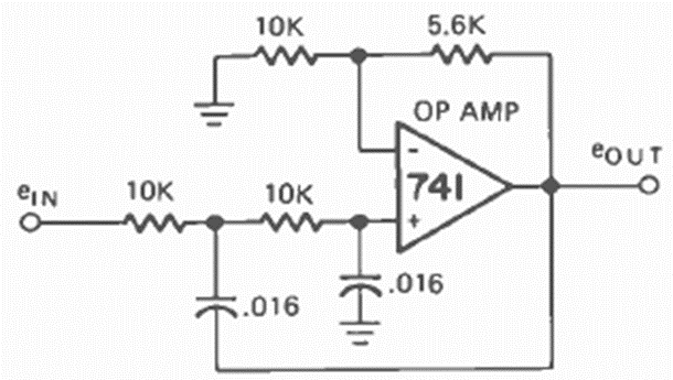 The 1 kHz tuned filter shown uses a 741 op-amp. The components can be re-scaled to suit the desired frequency.
