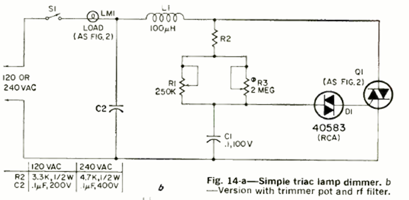 Another dimmer circuit. This dimmer for incandescent lamps was found in the July 1970 issue of Radio Electronics magazine. The triac must be equipped with a heat sink and its current must be adjusted according to the controlled load.