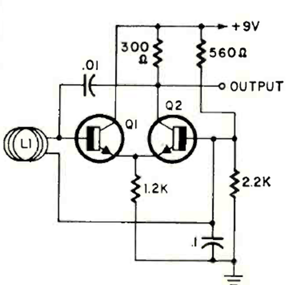 The frequency of this oscillator varies between 7 and 30 MHz when someone approaches the sensor coil. This coil is made up of 10 to 20 turns of wire with a diameter of 10 cm to 4 meters. It is recommended to experiment according to the application. The circuit is from a Radio Electronics from May 1970.