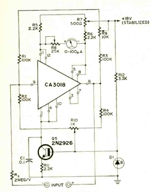 Using an RCA CA3018 as a base, this circuit has a sensitivity of 2 Mohms per volt. The circuit is from a Radio Electronics magazine from November 1970.