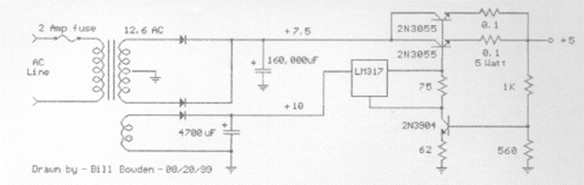 This power supply was found in documentation from the 90s. Two power transistors are used to increase the current capacity. They must be equipped with a heat sink.