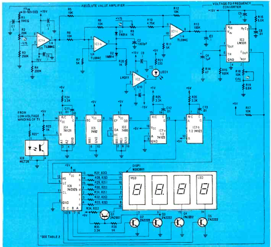 This circuit was found in the February 1983 issue of Radio Electronics magazine. It is a 4-digit circuit with dedicated integrated circuits, with no power supply indicated.