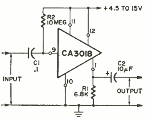Using the CA3018 released at the time, this circuit was found in the August 1970 Radio Electronics magazine. The circuit has an input resistance of 5 megohms.