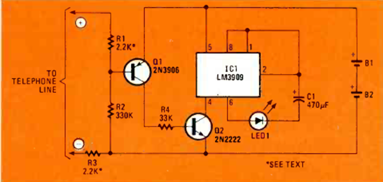 This circuit for common analog telephones was found in March 1982 Radio Electronics magazine. It applies to lines that have an extension (second telephone).