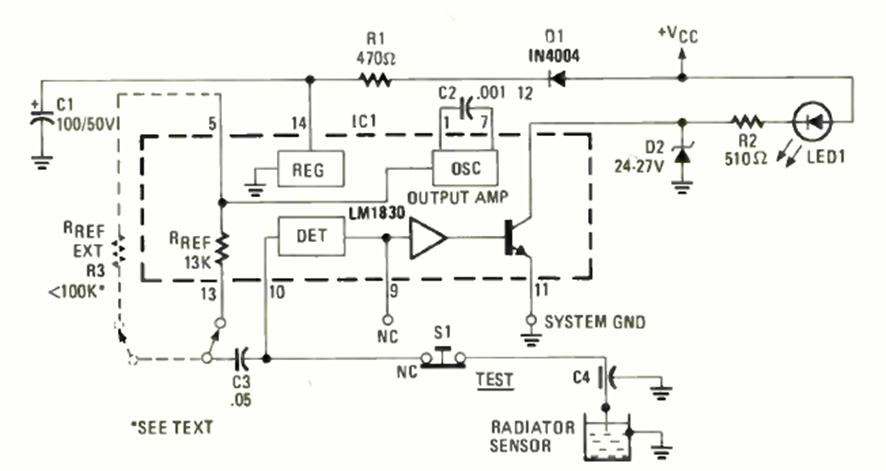 Found in the October 1979 Radio Electronics magazine, the purpose of this circuit is to monitor the coolant level in a car's radiator. The circuit is based on the LM1830.