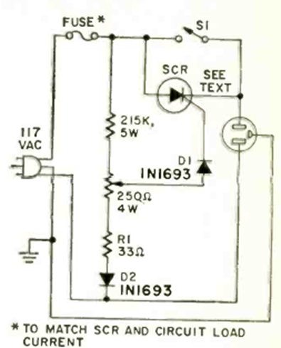 This circuit is from a Radio Electronics from February 1971. The SCR is load controlled and the circuit does not use a capacitor. The SCR must be equipped with a heat sink.