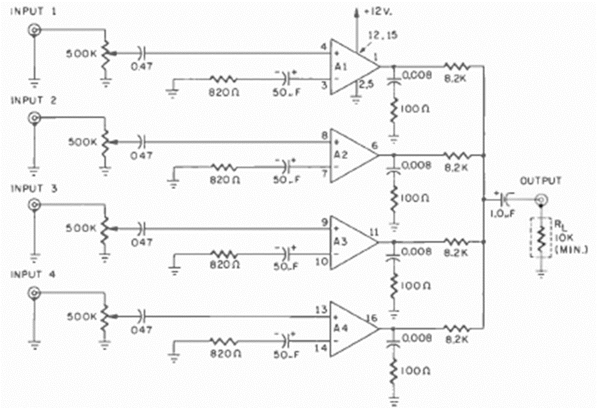 This mixer with 20 dB gain per channel uses RCA's CA3048 integrated circuits. We found it in the July 1971 Radio Electronics magazine. The power supply does not need to be symmetrical.
