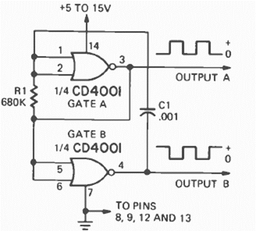 We found this circuit in the November 1974 Radio Electronics magazine. The frequency depends on C1 which can be changed up to the IC's oscillation limit of around 7 MHz at 10 V.
