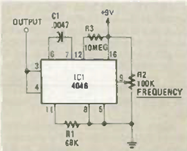 The frequency of this circuit can be varied from zero. The circuit uses the CMOS 4046 and was found in the November 1984 issue of Radio Electronics magazine. The base frequency is given by C1.
