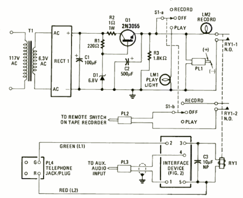 This telephone recording circuit was found in the June 1979 issue of Radio Electronics magazine. The components are common at the time and the power is supplied by the power grid.