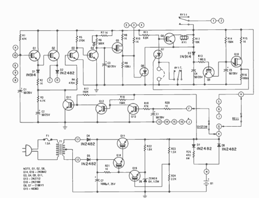 This circuit was obtained from the September 1977 issue of Radio Electronics magazine. The circuit is based entirely on transistors and two SCRs. The power supply with the inclusion of a battery is given.