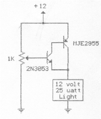 This high current control circuit was found in a publication from the 1990s. The power transistor must be equipped with a good heat sink. The current with the indicated transistor is of the order of 1 A.