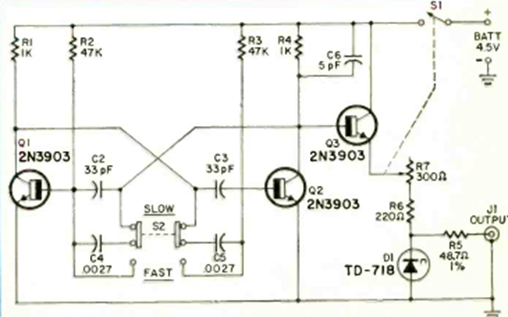 This small signal injector generator was found in the February 1971 issue of Radio Electronics magazine. The circuit uses general-purpose transistors of the time and can be implemented with current equivalents.