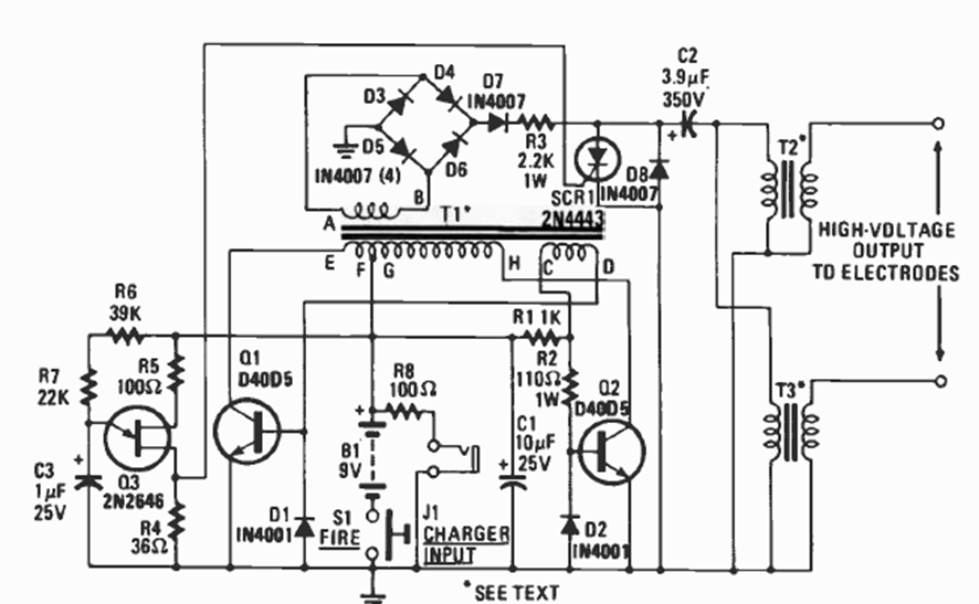 Published in the August 1986 issue of Radio Electronics magazine, this circuit acts as a weapon, capable of delivering strong shocks to anyone who touches it. The circuit operates at 10 kHz.