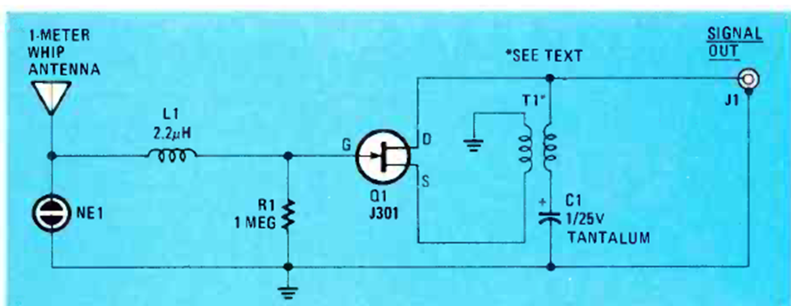 Found in the February 1983 Radio Electronics magazine, this circuit uses a FET and has good gain at the frequencies determined by the components. The FET is any general-purpose FET.