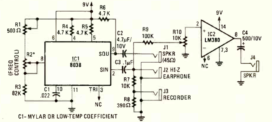 The frequency of each note depends on R2, which must be replaced by a keyboard. The circuit is from Radio Electronics from April 1980. The power supply is 9 V for the amplifier used.