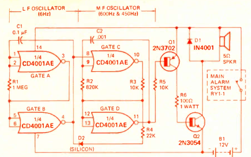 This powerful alarm circuit was found in the July 1975 issue of Radio Electronics magazine. The output transistor determines the power and must be equipped with a heat sink.