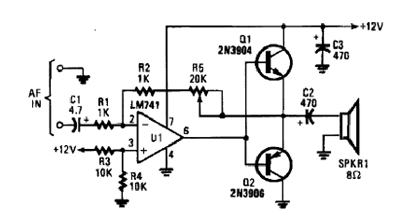 Found in a 1990s Popular Electronics, this circuit uses two transistors to boost the power of a 741 with audio signals. The power depends on the transistors used, which can be general-purpose types.