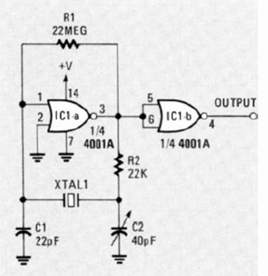 This is another one of the crystal oscillator configurations with the 4001. Many of them are on the site. This one was found in January 1987, Radio Electronics magazine.