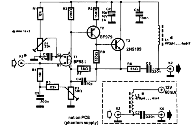 This circuit was obtained from Elektor magazine and published in the Encyclopedia of Electronic Circuits Vol 5 of 1995. Transistors are RF types that are still common today.