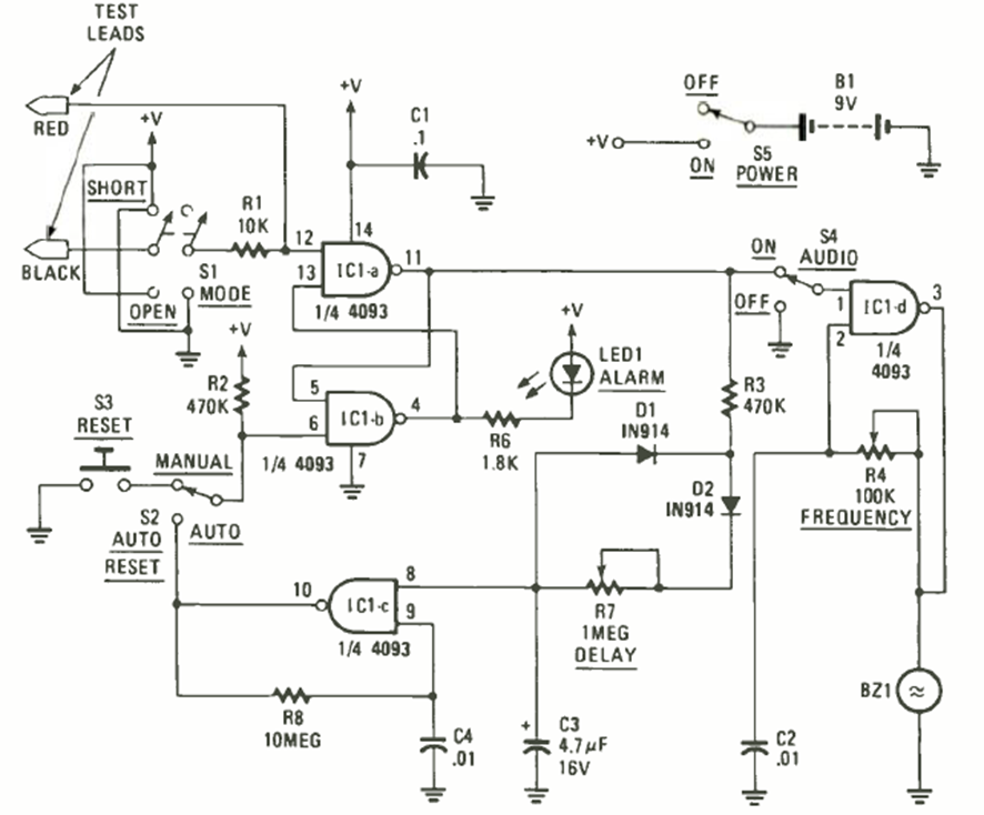 This 4093 IC continuity tester was found in the November 1986 Radio Electronics magazine. The circuit powers a ceramic buzzer with a frequency setting.
