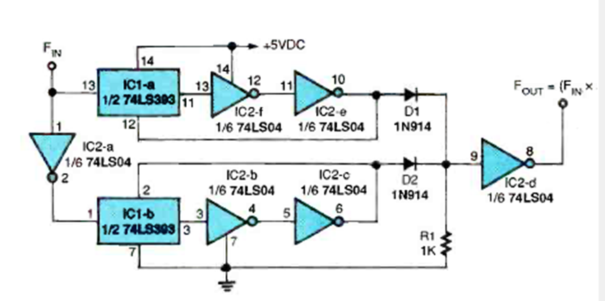 This TTL circuit found in the September 1996 issue of Electronics Now magazine doubles the frequency of a rectangular signal. The power supply must be 5 V.