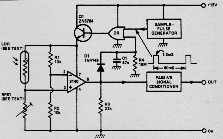 This circuit is from an English publication of 1982. The bipolar transistor can be a BC548 and the MOSFET any type according to the relay. The circuit works in a pulsating regime to present an extremely low consumption. The sampling pulse generator can be a CMOS oscillator. The sensor is an NTC and the adjustment trimpot must have the same order of value as this component at room temperature. The relay is 12 V, and the signal conditioner must guarantee an output without bounces for processing.