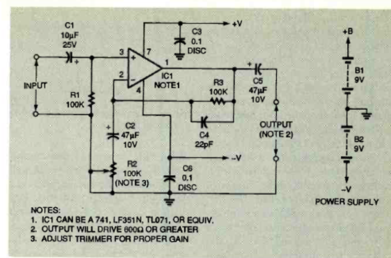 This Hughes circuit is from 1968. Equivalent modern components can be used. The input impedance is...