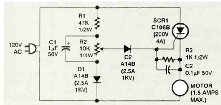 This simple SCR control was found in the December 1987 issue of Radio Electronics magazine. The circuit uses a well-known C106 but can be used in equivalents of the same series.
