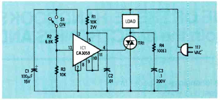 The integrated circuit used in this circuit is from the time of publication. The circuit is from a Radio Electronics from October 1987. The triac must be equipped with a heat sink.