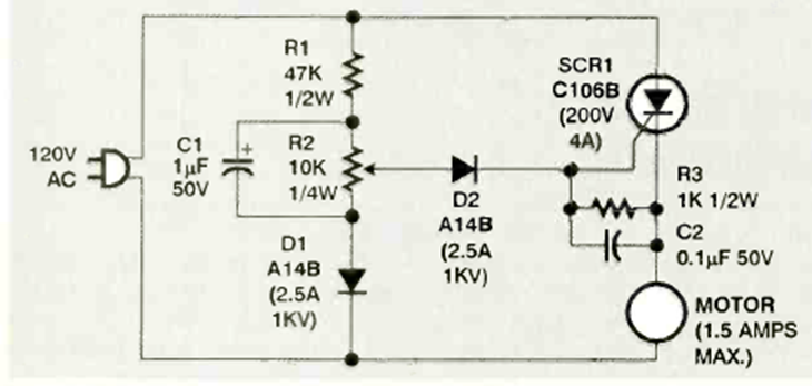 This sewing machine motor control was found in the December 1997 Electronics Now magazine. The half-wave circuit uses a 106-type SCR.