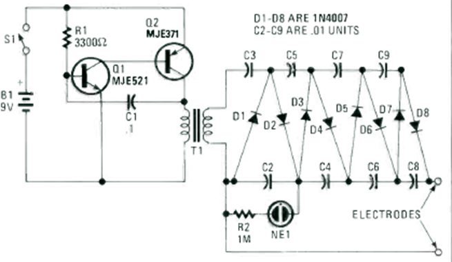 This electronic defense was found in the 1990 special issue of Radio Electronics Experimenter magazine. A few hundred volts is generated.