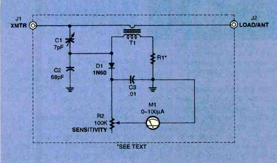 This transmitter power meter was found in the March 1999 issue of Electronics Now magazine. The circuit uses an analog indicator and does not require a power supply.