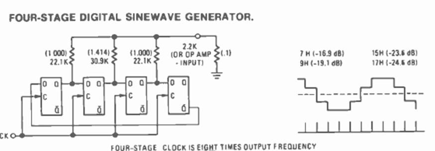 The figure shows how to generate a sinusoidal signal using 4 flip-flops. The circuit is from a Radio Electronics magazine from November 1976. The clock frequency is divided by 8.