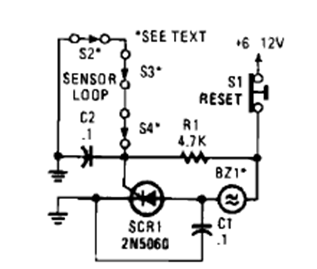 This circuit without sensors in series triggering an SCR was found in volume 5 of the 1995 Encyclopedia of Electronic Circuits. The circuit can have the number of sensors changed.
