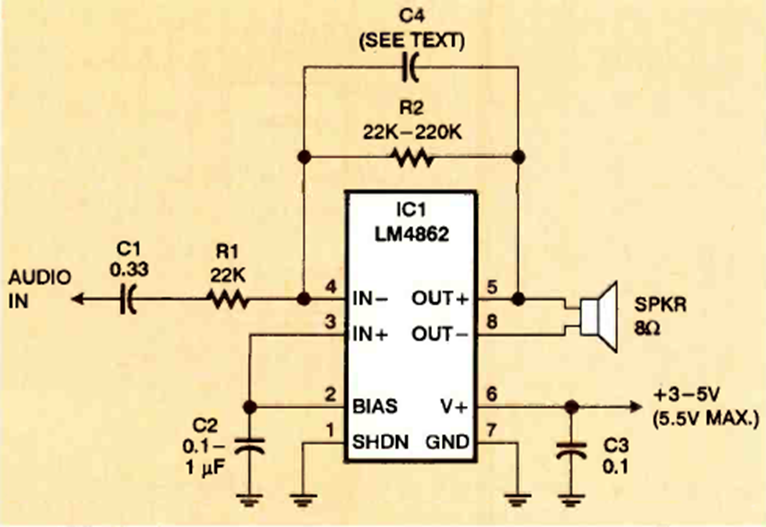 This small amplifier with the fraction-watt LM4862 was found in the November 1999 issue of Electronics Now. The power supply is low voltage.