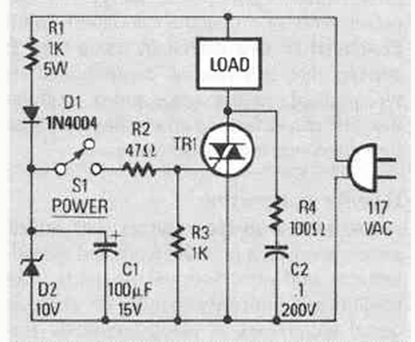 This circuit was found in the 1989 Radio Electronics Experimenter edition. The circuit has the triac according to the load that is to be controlled.