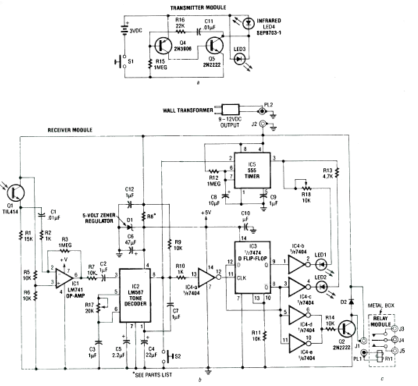 This circuit was found in the Electronics Experimenter Handbook from 1991. The circuit controls a simple relay for the purpose of turning circuits on or off or switching audio channels.
