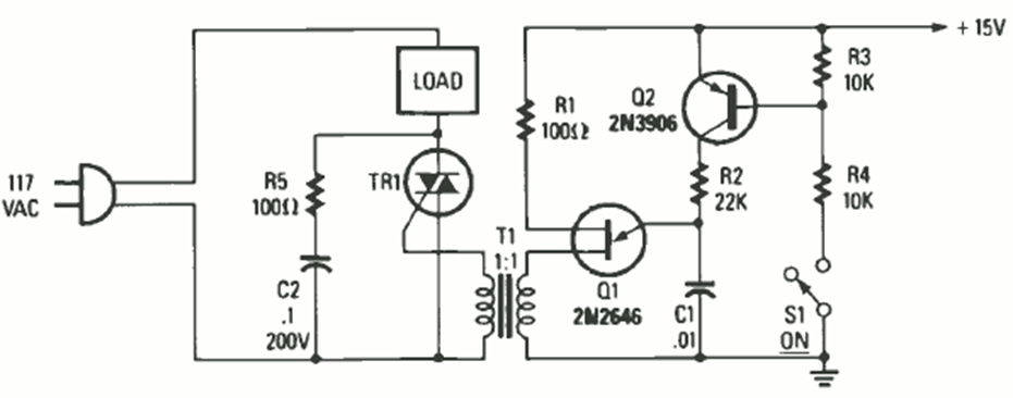 This triac circuit was found in the October 1987 Radio Electronics magazine. The triac is load-dependent and must be mounted on a heat sink.