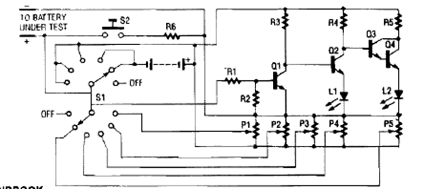 This test circuit was found in the PE Hobbyst Handbook in a 1990s edition. The circuit tests the battery under load. The load, as the battery is selected by the switch.