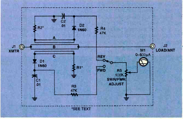 This circuit was found in the March 1999 issue of Electronics Now magazine. The meter is analog and does not require a power supply. The circuit is for the VHF band.