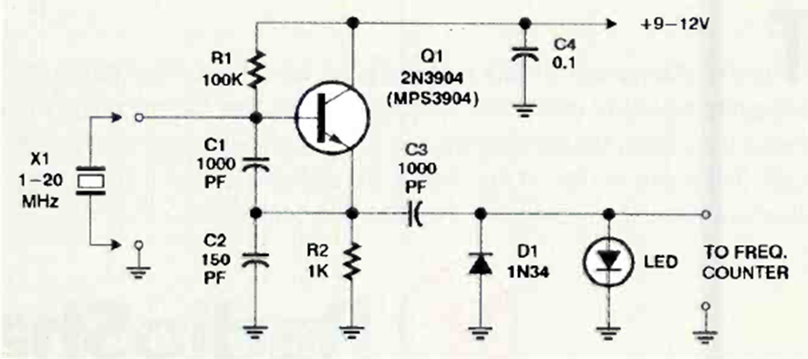 This circuit can be used to test crystals from 1 to 20 MHz and also has an output to measure their frequency. We found it in the November 1998 Electronics Now magazine.