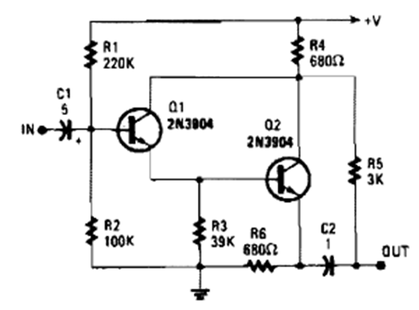 This two-transistor amplifier stage was obtained from the Encyclopedia of Electronic Circuits Volume 5 of 1995. The input is high impedance, and the output is made at R3.
